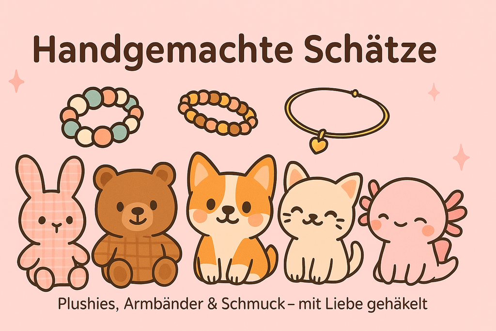 Heute gestalte ich handgemachte Plüschies – kleine, flauschige Freunde voller Charakter – und Matching-Armbänder, die Menschen verbinden. 🌸