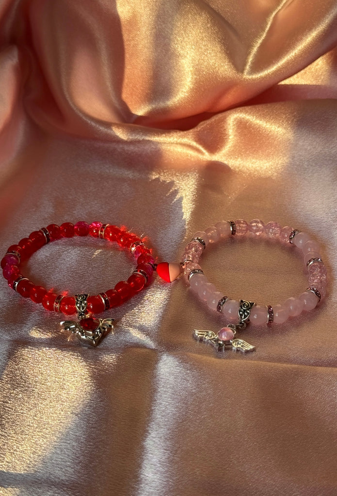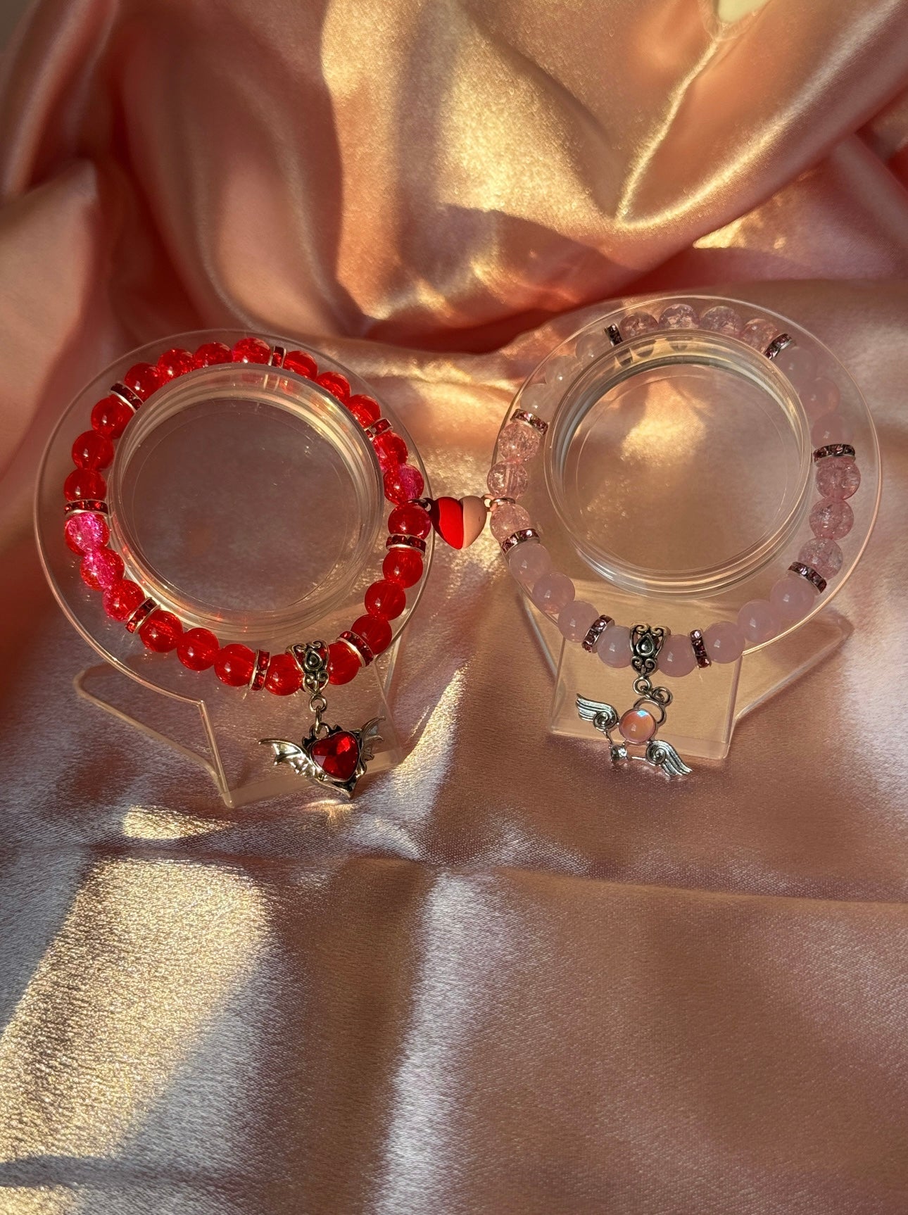 • Rotes Armband: Strahlende rote Glasperlen, verziert mit silbernen Details und einem auffälligen Herzanhänger, der von zarten Engelsflügeln umrahmt wird. Der Herzanhänger funkelt in tiefem Rot und symbolisiert Leidenschaft und Liebe.